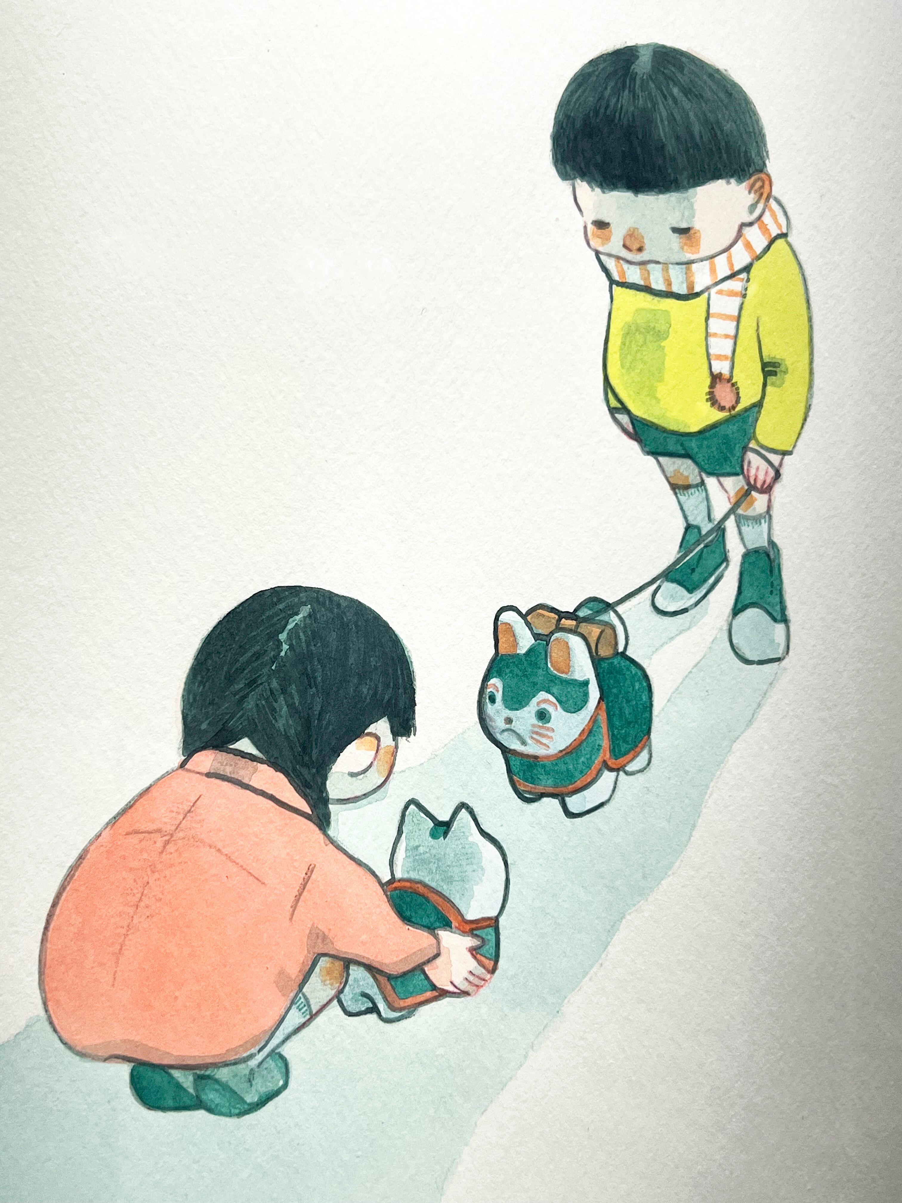 本企画では、ヤマシタ作品の中でも印象の強い「子供」の描写に注目し、子供服のファッション誌のカットのようなスタイルでヤマシタのシュールでかわいらしい世界観を存分に出力しております。