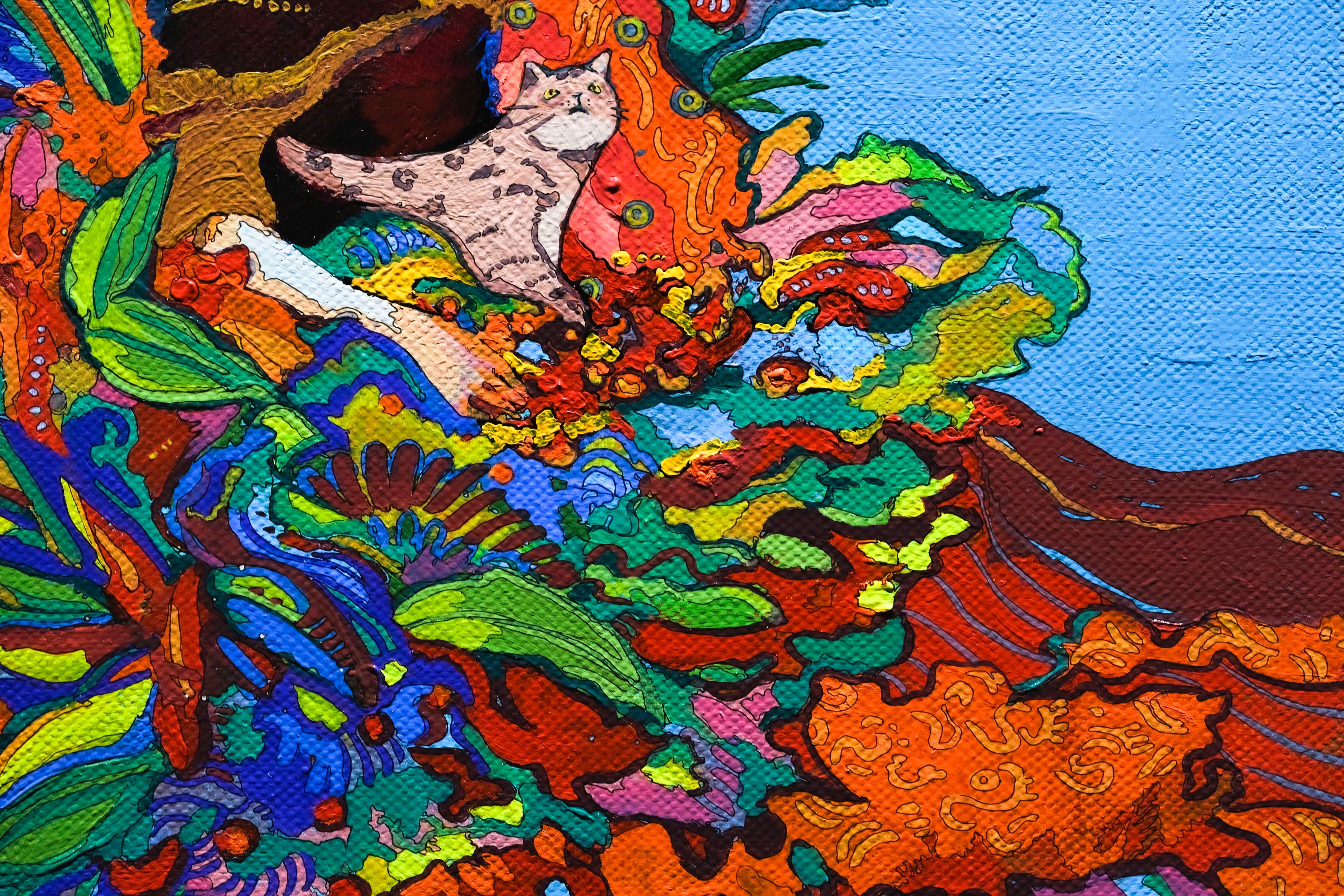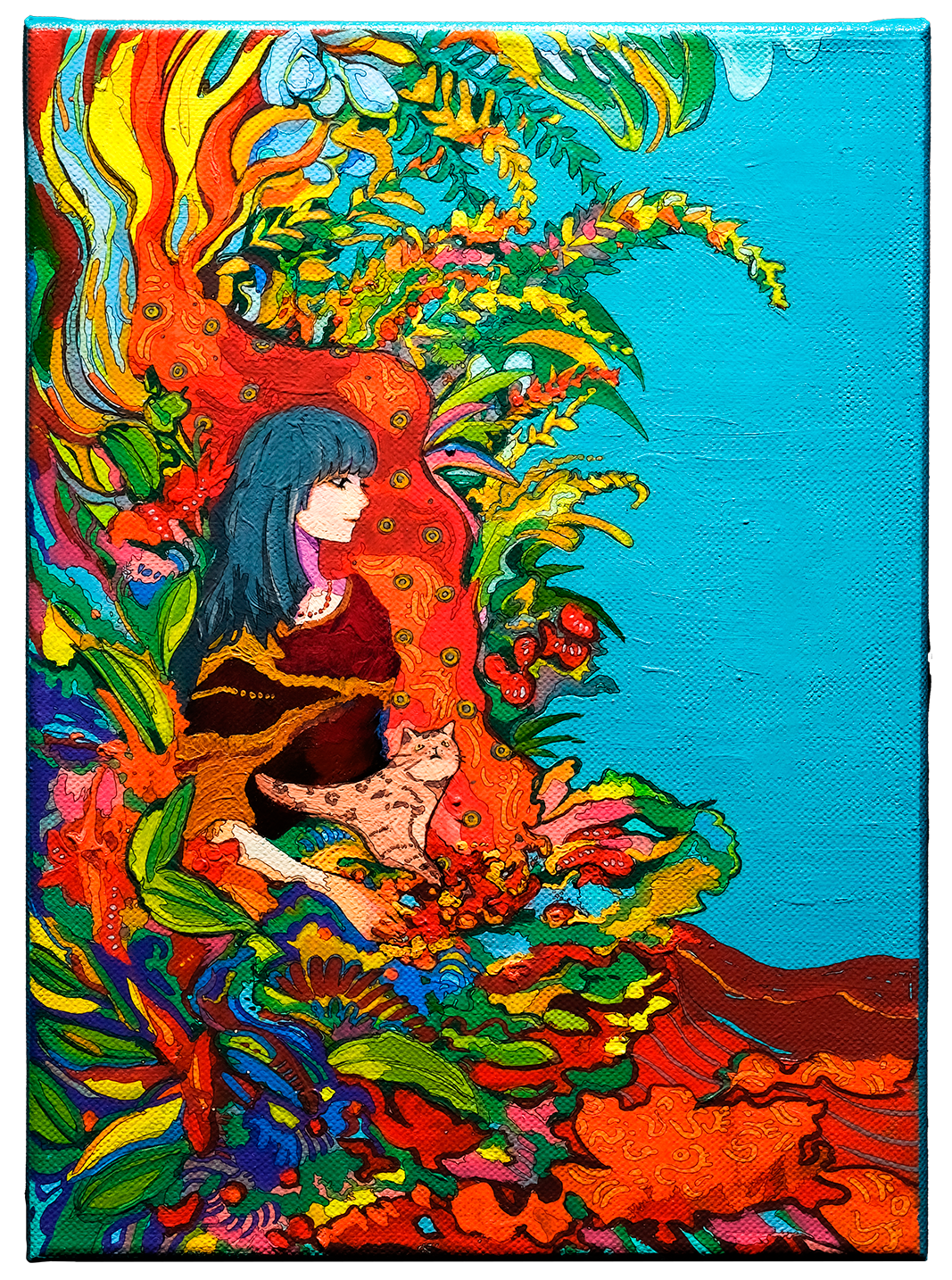 自身のインスピレーションに任せて引いた線や模様を使い、幻想的でカラフルな世界観のイラストを描く。