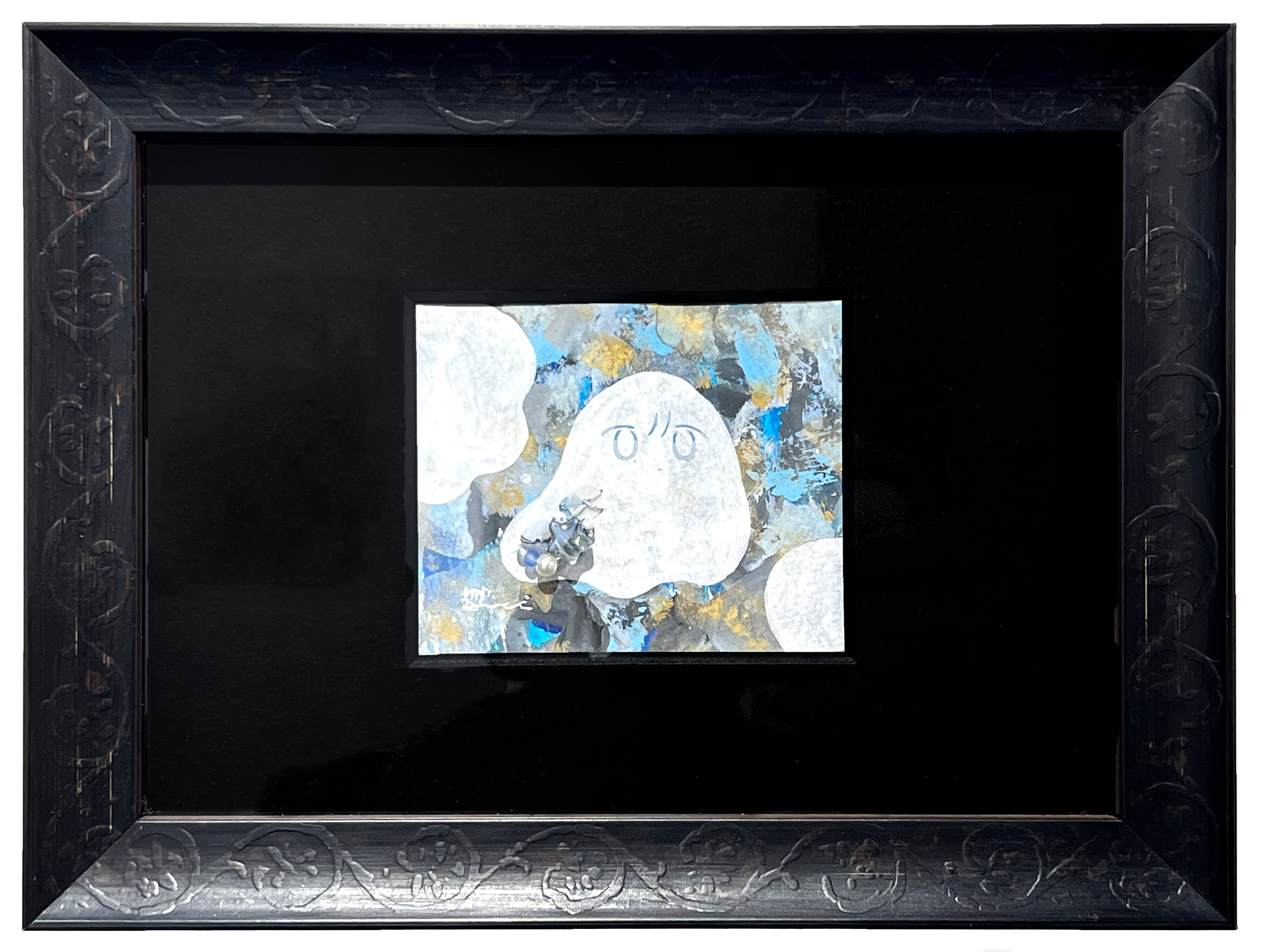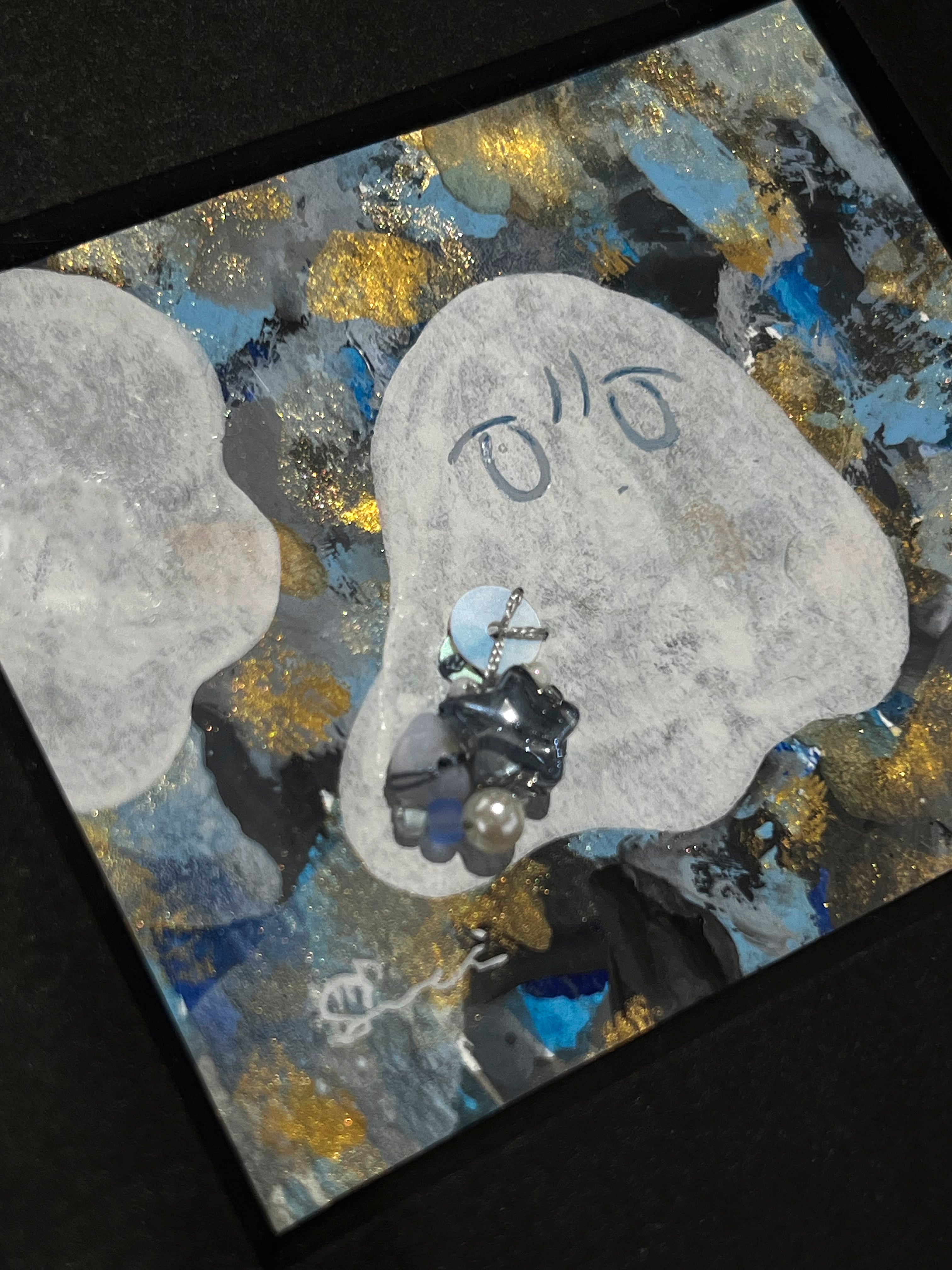 特定のシルエットを持たず、半抽象的な少女像をアイコンに、スパンコールやレース等コラージュを組み合わせたミクスドメディア作品を展開している。