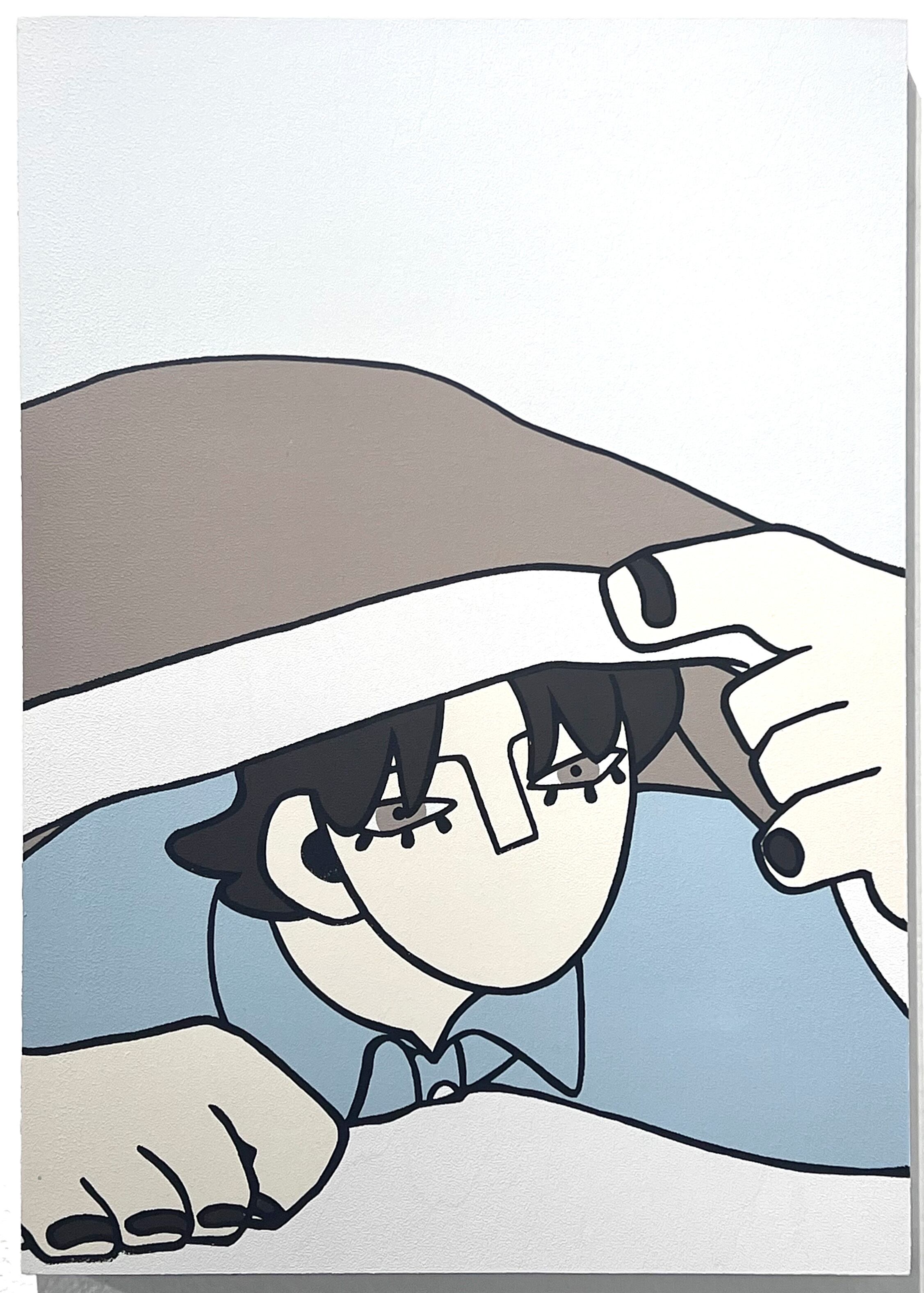 正井の描く人物はどれもアイコニックで特徴的な目に無表情と、捉え難い存在に見えます。全体の状況も限られた描写の中で見るしかなく、考える隙を鑑賞者に与えます。この、どことも捉えられない限定的な表情に、正井は私たちに、その世界が現実由来なのか、はたまた映画のワンシーンなのかと境界なく見せてくれます。(きのね)