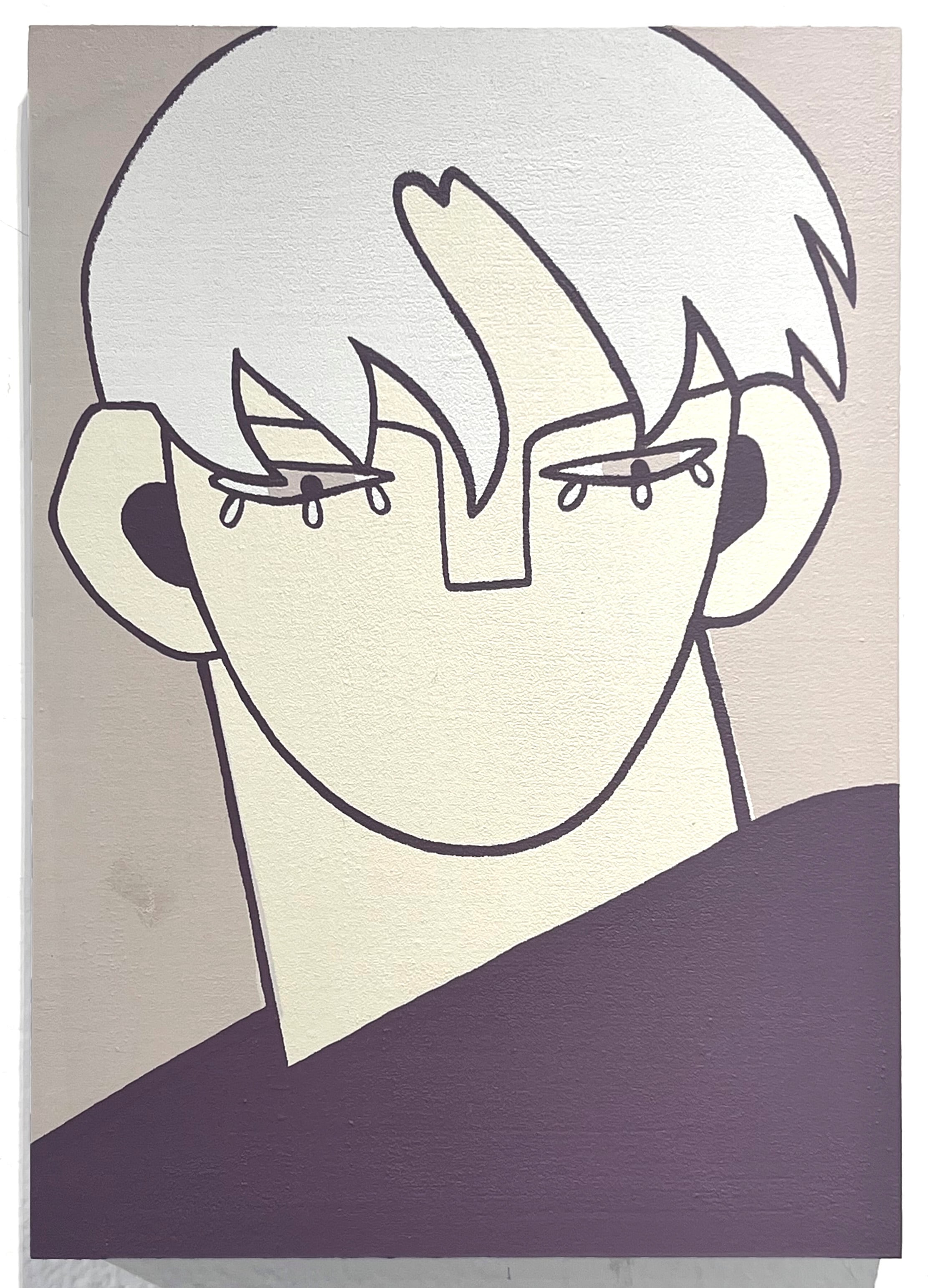 正井の描く人物はどれもアイコニックで特徴的な目に無表情と、捉え難い存在に見えます。全体の状況も限られた描写の中で見るしかなく、考える隙を鑑賞者に与えます。この、どことも捉えられない限定的な表情に、正井は私たちに、その世界が現実由来なのか、はたまた映画のワンシーンなのかと境界なく見せてくれます。(きのね)